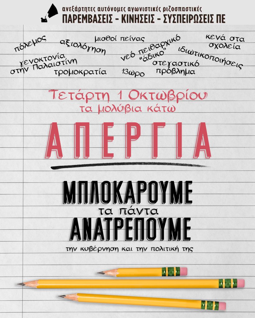 Συναδέλφισσες/οι, την 1η Οκτώβρη στέλνουμε μήνυμα αγώνα για να ανατραπεί η αντιλαϊκή πολιτική της κυβέρνησης. Να πέσει η κυβέρνηση που το μόνο που μπορεί να υποσχεθεί στον λαό είναι φτώχεια, πόλεμο και απελπισία!