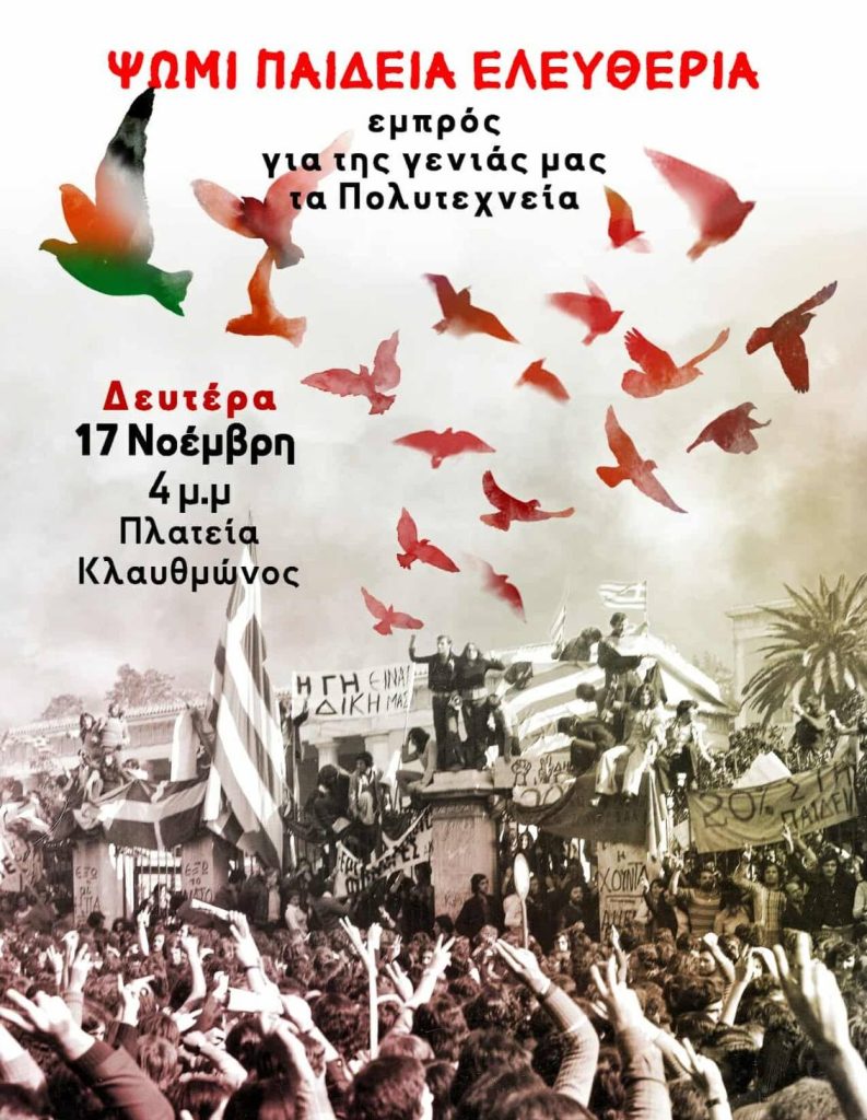 Και μαζεύτηκαν οι φοιτητές της Αρχιτεκτονικής κι έκαναν συνέλευση της σχολής τους κι αποφάσισαν κατάληψη. Και τη νύχτα αργά, κατ’ εντολή του πρύτανη, η αστυνομία μπήκε στη σχολή και τους συνέλαβε. Και μερικά τετράγωνα παρακάτω από το Πολυτεχνείο, η αστυνομία χτυπούσε γονείς, 7χρονα παιδιά, εκπαιδευτικούς, γιατί ζητούσαν ΠΑΙΔΕΙΑ. Και χιλιάδες εκπαιδευτικοί που πολεμάνε για ΠΑΙΔΕΙΑ και ΕΛΕΥΘΕΡΙΑ στέλνονται στα πειθαρχικά για τα περαιτέρω. Κι αυτά γίνονται τώρα.