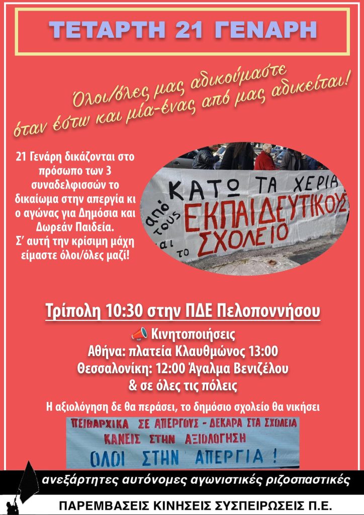 Η 21η Γενάρη πρέπει να γίνει μέρα καταδίκης του Υπουργείου και της κυβέρνησης, της επίθεσης στο απεργιακό δικαίωμα, στους συλλογικούς αγώνες και τα σωματεία, των νόμων Χατζηδάκη Γεωργιάδη αλλά και των Δ/ντων Εκπαίδευσης που παρέπεμψαν σε πειθαρχικά απεργούς εκπαιδευτικούς , Δ/ντών Εκπαίδευσης που παρανόμησαν με την καθοδήγηση του ΥΠΑΙΘΑ, αγνοώντας τη νόμιμα προκηρυγμένη από τη ΔΟΕ & ΑΔΕΔΥ και σε ισχύ Α-Α .