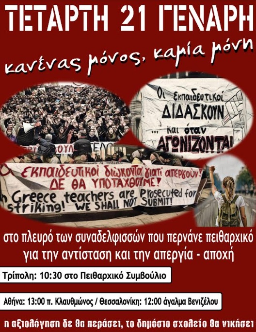 Στις 21 Γενάρη στην Τρίπολη δικάζονται στο πρόσωπο των εκπαιδευτικών το δικαίωμα στην απεργία κι ο αγώνας αγώνα για Δημόσια και Δωρεάν Παιδεία. Σ’ αυτή την κρίσιμη μάχη είμαστε όλοι/όλες μαζί!